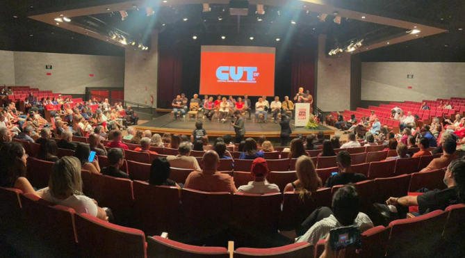 Na noite dessa quinta-feira (28), o Teatro dos Bancários de Brasília foi palco do ato político em homenagem aos 42 anos da Central Única dos Trabalhadores, que se consolidou como a maior central sindical do Brasil, da América Latina e a quinta maior do mundo. Atualmente, são quase 8 milhões de associados. Com a presença de lideranças do movimento social, parlamentares, figuras políticas históricas, militantes, representantes sindicais, a atividade abriu a 17ª Plenária Distrital da CUT-DF: “Novos Tempos, Novas Lutas”.