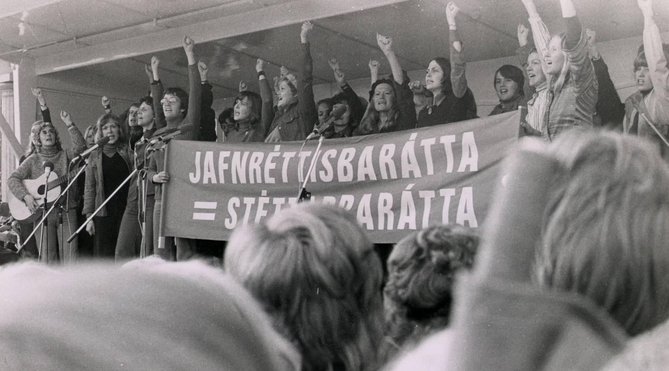 “A greve foi um sucesso. Nunca tinha visto nada igual. Foi uma festa pela igualdade”, lembra emocionada Gerdur Steinthorsdottir. Vivaz e sorridente, essa ex-professora de 73 anos foi uma das organizadoras da greve. Uma iniciativa que partiu dos grupos feministas, por ocasião do Ano Internacional da Mulher designado pela ONU, e que foi apoiada por partidos, sindicatos e todo tipo de organizações. Mais de 25.000 mulheres se reuniram na praça central de Reykjavík em uma maciça manifestação festiva para exigir seus direitos. Foi um ponto de inflexão em um país onde, embora as mulheres tivessem o direito de votar desde 1915, havia apenas três mulheres no parlamento: 5% das cadeiras. Nas eleições seguintes, cinco anos depois, a Islândia elegeu pela primeira vez uma mulher presidenta, Vigdis Finnbogadottir.