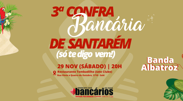 Quando o mês de novembro chega pode-se dizer que está oficialmente aberta a agenda de ‘confras’ de fim de ano, e dessa vez a subsede em Santarém se antecipou e já te convida para a 3ª Confra Bancária no dia 29 de novembro (sábado), às 20h, no restaurante Tombadilho no Iate Clube – Rua 24 de outubro, 3718 – Salé.