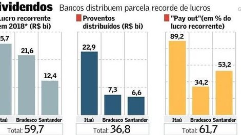 Os três maiores bancos privados do país distribuíram R$ 36,8 bilhões aos acionistas relativos ao ano passado nas formas de dividendos, juros sobre o capital próprio (JCP) e recompra de ações. O número equivale a 61,7% do lucro líquido ajustado que Itaú Unibanco, Bradesco e Santander alcançaram juntos em 2018, de R$ 59,695 bilhões.