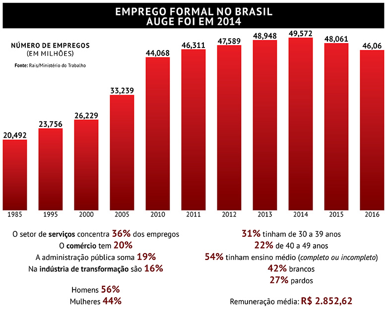 Mais da metade dos ocupados (54,2%) eram trabalhadores com ensino médio completo ou incompleto. Aqueles com ensino superior (também completo ou incompleto) eram 25,3% do total. A maior perda de vagas em 2016 concentrou nos menos escolarizados: queda de 11,52% entre analfabetos ou com fundamental incompleto e de 8,6% entre aqueles com ensino fundamental completo. No ensino médio, a redução foi de 3,89%. A Rais mostrou ligeira alta entre aqueles com ensino superior (0,66%).