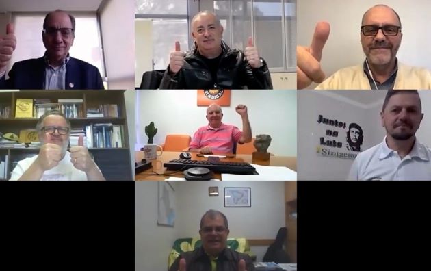Clemente (no alto, à direita) com dirigentes de centrais sindicais: resistência aos ataques e propostas para retomada da atividade econômica