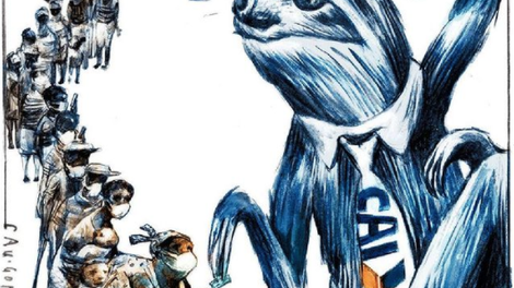 Na charge, numa fila a perder de vista, os beneficiários do auxílio emergencial se submetem ao sacrifício na busca por socorro de suas necessidades prementes, com postura, olhares e gestos de famélicos. Na ponta, a Caixa distribui migalhas pelas mãos de um bicho-preguiça, numa referência aos trabalhadores da empresa.