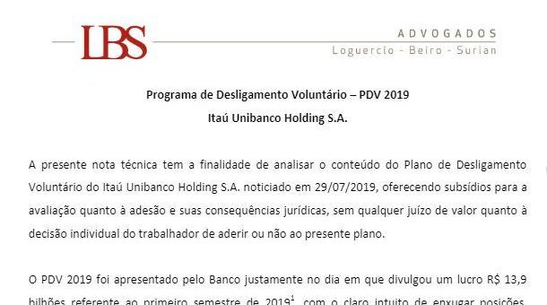 Brasília - A assessoria jurídica do Sindicato elaborou um parecer técnico sobre o Plano de Desligamento Voluntário (PDV) do Itaú, anunciado no dia 29 de julho, a fim de orientar os bancários, oferecendo subsídios para a avaliação quanto à adesão e suas consequências jurídicas, sem qualquer juízo de valor quanto à decisão individual do trabalhador de aderir ou não ao plano.