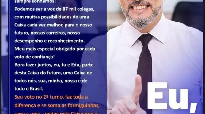 > Para votar, acesse https://eleicaoca.caixa.gov.br. Insira matrícula, senha pessoal e vote 0001 Eduardo.