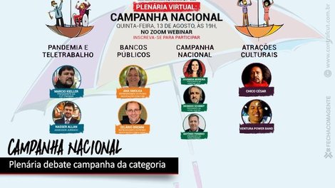 Nesta quinta-feira (13), às 19h, vai ter a Plenária Virtual da Campanha Nacional d@s Bancári@s. A plenária é promovida pela Federação dos Trabalhadores em Empresas de Crédito do Paraná (Fetec-CUT/PR). Vão falar sobre a campanha a presidenta da Confederação Nacional dos Trabalhadores do Ramo Financeiro (Contraf-CUT), Juvandia Moreira; o presidente da Fetec- CUT PR, Deonisio Schmidt, e o presidente do Sindicato dos Bancários de Curitiba, Antônio Fermino.