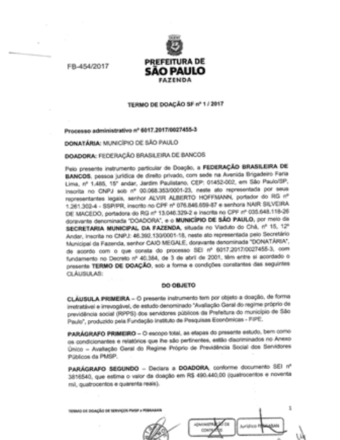 Quatro semanas depois, no Diário Oficial de 23 de setembro de 2017, é divulgado o resumo do termo de doação, com o valor investido pela Febraban: R$ 490.440,00. O documento ainda acrescenta quem é a responsável pelo estudo, a Fipe — Fundação Instituto de Pesquisas Econômicas. Outra informação importante no documento é que os serviços vão durar seis meses. O termo de doação é assinado em 12 de setembro de 2017, então podemos concluir que o prazo se encerrou em 12 de março de 2018. O estudo, porém, não foi divulgado até o momento.