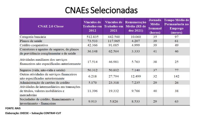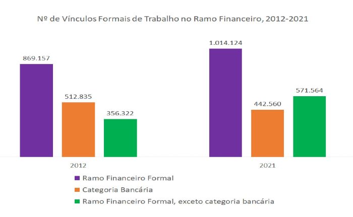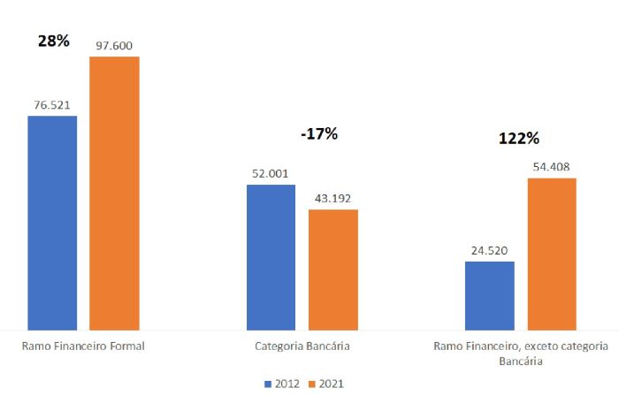 Entre 2012 e 2021, a categoria bancária perdeu 70.275 postos de trabalho, mas as empresas do ramo financeiro formal contrataram 215.242 trabalhadores, com salários menores e piores condições de trabalho. Na base da Federação dos Bancários do Centro-Norte (Fetec-CUT), houve o fechamento de 8.800 postos de trabalho (corte de 17%) na categoria bancária no mesmo período, enquanto os outros setores do ramo financeiro contrataram 29.888 trabalhadores, um crescimento de 122%.