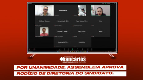 Nos termos do artigo 13, §1°, do Estatuto Social, Assembleia Geral Extraordinária realizada nesta sexta-feira, 28, bancários e bancários do Pará, aprovaram, por unanimidade, o rodízio de diretoria do Sindicato.