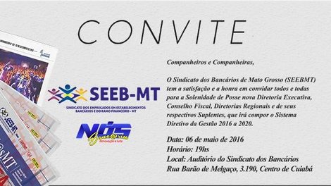 Cuiabá MT - O SEEB/MT tem a satisfação e a honra em convidar todos e todas para a Solenidade de Posse nova Diretoria Executiva, Conselho Fiscal, Diretorias Regionais e de seus respectivos Suplentes, que irá compor o Sistema Diretivo da Gestão 2016 a 2020. A cerimônia de posse será dia 06 de maio, ás 19h, no auditório do Sindicato (Rua Barão de Melgaço, 3.190, Centro de Cuiabá).