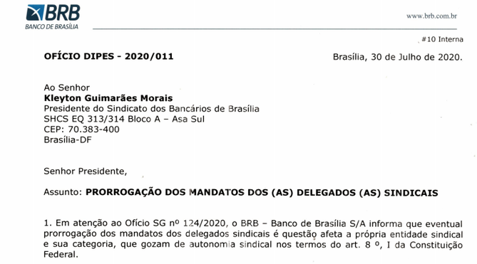 Após intenso diálogo do Sindicato com a gestão do BRB sobre a prorrogação do mandato de delegado sindical para evitar os riscos de uma eleição convencional em plena pandemia de Covid-19, o banco acatou a solicitação (leia ofício ao final da matéria), com o entendimento de que esta questão é de competência da entidade sindical.