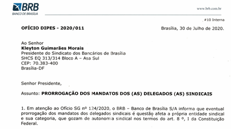 Após intenso diálogo do Sindicato com a gestão do BRB sobre a prorrogação do mandato de delegado sindical para evitar os riscos de uma eleição convencional em plena pandemia de Covid-19, o banco acatou a solicitação (leia ofício ao final da matéria), com o entendimento de que esta questão é de competência da entidade sindical.