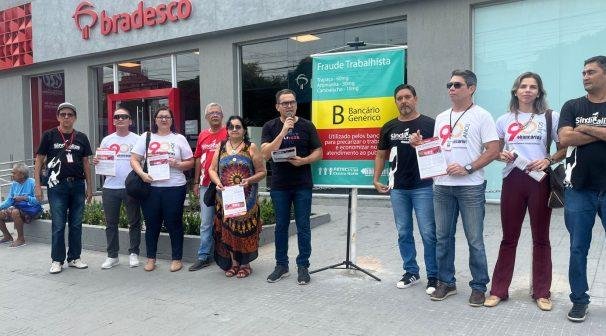 Enquanto do lado de dentro dos bancos privados no Pará, bancários e bancárias do Bradesco, Santander e Itaú se preparavam para mais um dia de trabalho com metas para bater em cima de cobranças. Do lado de fora, dirigentes do Sindicato, alguns colegas de trabalho de empregados das respectivas instituições, denunciavam publicamente uma jornada de trabalho doentia que poucos sabem.