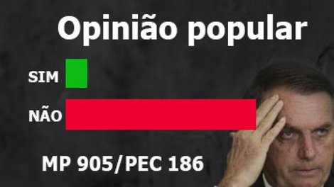 Até esta quinta-feira (28), a Medida Provisória (MP) 905/2019, do Programa Verde e Amarelo, que altera leis trabalhistas e institui a carteira sem direitos, tinha 56.624 votos. Do total, 96,2% (54.651) eram contrários à medida e somente 3,7% (2.114) eram favoráveis.