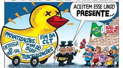 O pato antidemocrático na mídia – Na semana passada, a Fiesp “investiu” propagandas em no mínimo quatro importantes jornais, impressos e digitais, a favor do impeachment da presidenta Dilma Rousseff. De acordo com o Tijolaço, pelo cálculo de tabela de publicidade somente em impressos, os anúncios no Estadão e na Folha teria custado à entidade cerca de R$ 5 milhões.