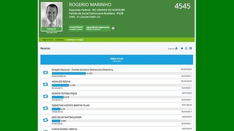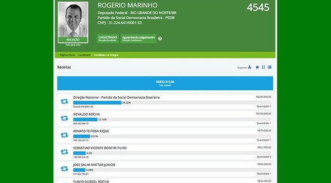 A última atualização é de terça-feira (11). Até agora, o deputado potiguar contabiliza R$ 822.315,60 em receitas, aproximadamente um terço do limite legal (R$ 2,5 milhões). Dois empresários do grupo Riachuelo, Nevaldo Rocha e Flávio Gurgel Rocha, aparecem como doadores, o primeiro com R$ 100 mil (12,16% do total) e o segundo com R$ 50 mil (6,08%). Assim, apenas essa empresa representa 18% da receita atual. Os empresários, originalmente, são do Rio Grande do Norte, estado do parlamentar.