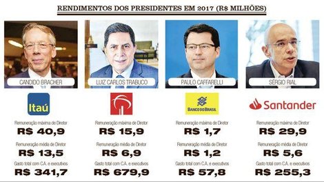 Não apenas os acionistas surfaram no lucro de R$ 57,63 bilhões de Itaú, Bradesco, Banco do Brasil e Santander em 2017. Também ganharam diretores e conselheiros, cujas rendas milionárias ficaram conhecidas nesta terça-feira 26, devido à decisão do Tribunal Regional Federal da 2ª Região (TRF2), que obrigou empresas de capital aberto a abrir as remunerações máximas e mínimas de seus executivos.