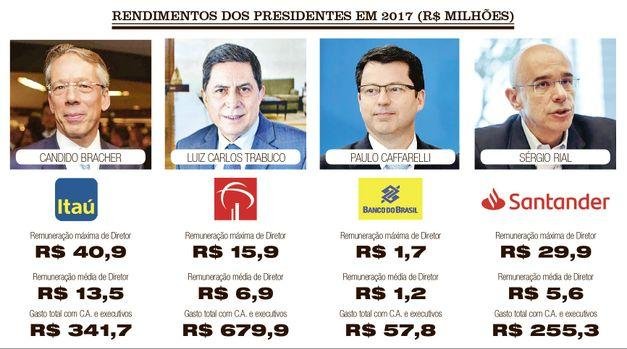 O mais bem pago diretor de banco foi Cândido Bracher, do Itaú, cujos rendimentos somaram R$ 40,9 milhões em 2017, entre salários e participações. No cargo há um ano e oito meses, Bracher susbtituiu Roberto Setúbal na direção do maior banco privado do país.