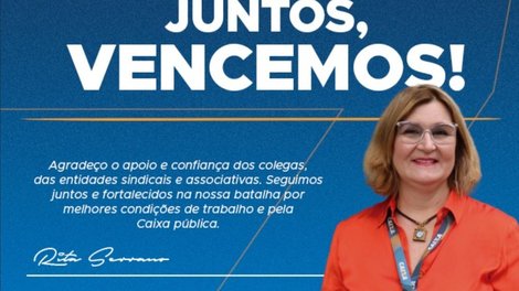 “Agradeço a todas e a todos que confiaram em mim. Essa votação expressiva mostra que estamos no caminho certo. Além disso, renova a minha convicção de que lutar pela Caixa 100% pública e pelos direitos dos empregados é a certeza de um trabalho bem feito e de dias melhores”, comemorou. “Essa vitória não é só minha, é das entidades, associações, confederações, sindicatos e, principalmente, dos trabalhadores e trabalhadoras que acreditam que teremos dias melhores”, agradeceu a conselheira reeleita.