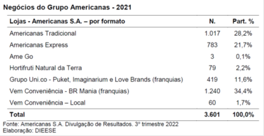 No documento divulgado pelo Dieese, com base em informações financeiras divulgadas pela própria Americanas, é possível se observar que o Grupo Americanas possuía, em 2021, lojas próprias em todos os estados brasileiros e em 938 municípios, sendo que, quase metade delas (1.937) estava no Sudeste (49,6%). As demais estavam distribuídas regionalmente no Nordeste (22,6%); Sul (10,4%); Norte (9%) e Centro-Oeste (8,4%).