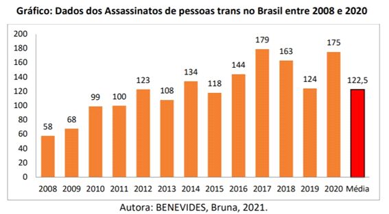 Com relação à violência, o levantamento aponta que, de 2010 para 2020, o número de assassinatos de pessoas trans aumentou de 99 para 175, um aumento de 76,8%. Os números totais de 2021 ainda não foram computados, mas dados do Boletim 002-2021, da Antra, apontam que foram registrados 89 assassinatos de pessoas trans no primeiro semestre do ano passado.