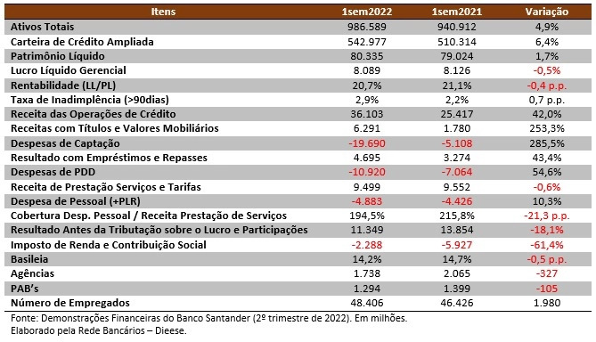 O lucro líquido gerencial do Banco Santander foi de R$ 4,084 bilhões no segundo trimestre de 2022, o que representa redução de 2,1% em relação ao mesmo período de 2021 e aumento de 2% em relação ao trimestre anterior. No semestre, o lucro alcança os R$ 8.089 bilhões, queda de 0,5% em comparação aos seis primeiros meses do ano passado. O retorno sobre o Patrimônio Líquido Médio Anualizado (ROE) do banco foi de 20,7%, com queda de 0,4 ponto percentual (p.p.) em 12 meses. O lucro no Brasil representou 27,9% (€ 1,365 bilhão) do banco global (€ 4,894 bilhões), que apresentou alta de 16% em 12 meses.