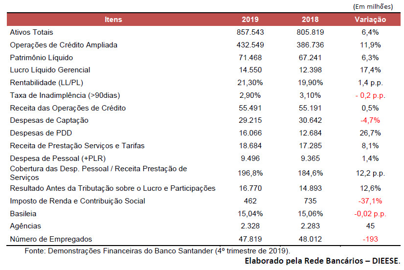 Segundo análise realizada pelo Departamento Intersindical de Estatística e Estudos Socioeconômicos (Dieese), o resultado no Brasil foi positivamente impactado pela entrada de créditos tributários no montante de R$ 3,3 bilhões e pelas receitas de serviços e tarifas. A rentabilidade (Retorno sobre o Patrimônio Líquido Médio Anualizado – ROE) foi de 21,3%, com alta de 1,4 pontos percentuais em doze meses.