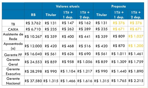No encontro de hoje (16), a Caixa trouxe como proposta a manutenção de 3,5% da contribuição do titular, com valor fixo de R$ 450 por dependente, mas mantendo o teto de 10% da remuneração, conforme tabela abaixo. Caso essa proposta seja implementada, os dependentes passariam a arcar com 48% das despesas e os titulares com 52%.