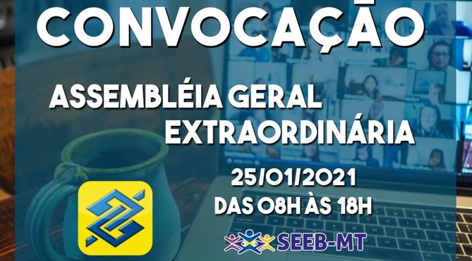 Sindicato dos Empregados em Estabelecimentos Bancários e do Ramo Financeiro do Estado de Mato Grosso – SEEB-MT, inscrito no CNPJ/MF sob o nº 03.484.839/0001-30, Carta Sindical livro nº 35, folha nº 41, Ano 1963, por seu presidente abaixo assinado, convoca todos os empregados bancários e financiários do Banco do Brasil S/A da base territorial deste sindicato, para a Assembléia Extraordinária Específica que se realizará de forma remota/virtual durante o período das 08:00 horas até às 18:00 horas do dia 25 de janeiro de 2021, na forma disposta no site http://www.bancariosmt.com.br/ onde estarão disponíveis todas as informações necessárias para a deliberação acerca da seguinte pauta: apreciação e deliberação sobre a proposta de paralisação por prazo determinado a partir das 00h00m até às 23h59m do dia 29 de janeiro de 2021.