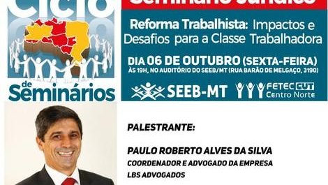 O Sindicato dos Empregados em Estabelecimentos Bancários e do Ramo Financeiro de Mato Grosso (SEEB-MT) e a Federação dos Trabalhadores em Empresas de Crédito do Centro Norte (Fetec-CUT/CN) promovem na próxima sexta-feira (06.10), um Seminário Jurídico com tema "Reforma Trabalhista - Impactos e Desafios para a Classe Trabalhadora".