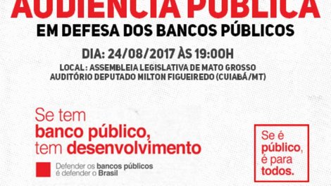 Com o objetivo de debater os impactos negativos da privatização dos bancos públicos: Caixa, Banco da Amazônia, BNDS, BRB E Banco do Brasil, será realizada nesta quianta-feira dia 24 de agosto, às 19h, uma Audiência Pública “Em defesa dos Bancos Públicos”, na Assembleia Legislativa de Mato Grosso, Auditório Deputado Milton Figueiredo (em Cuiabá/MT). A audiência foi requerida pelo deputado estadual Valdir Barranco (PT).