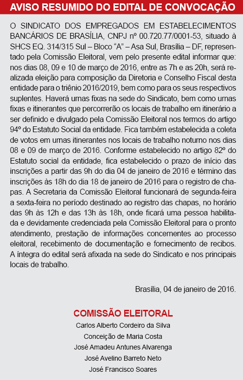 Brasília - Cumprindo determinação estatutária, a Comissão Eleitoral, após algumas reuniões, definiu o cronograma para a eleição da Diretoria e do Conselho Fiscal e suplentes para o triênio 2016/2019.
