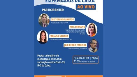 A plenária virtual conjunta tem como pauta discutir as questões pendentes com o banco, entre elas o pagamento justo da PLR Social, IPO da Caixa, a inclusão dos bancários como grupo prioritário na vacinação contra a Covid-19 e em defesa da Caixa 100% pública.