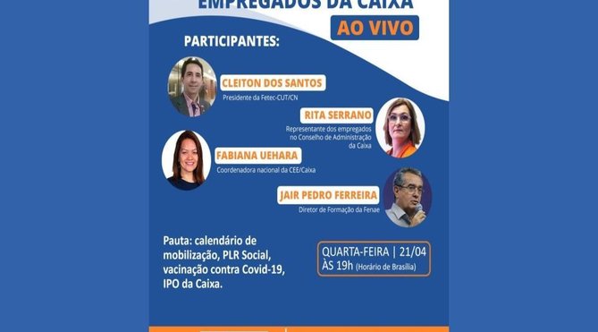 O Sindicato dos Bancários de Mato Grosso (Seeb/MT), em parceria com a Federação dos Bancários do Centro-Norte (Fetec-CUT), com a Confederação Nacional dos Trabalhadores do Ramo Financeiro (Contraf-CUT), a Federação Nacional das Associações do Pessoal da Caixa Econômica Federal (Fenae) e a Associação dos Gerentes da Caixa Econômica Federal – AGECEF/MT, realizarão na quarta-feira 21 de abril, às 19h, plenária virtual dos empregados da Caixa.