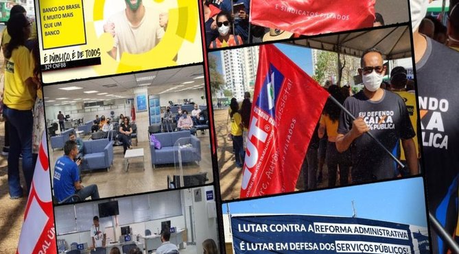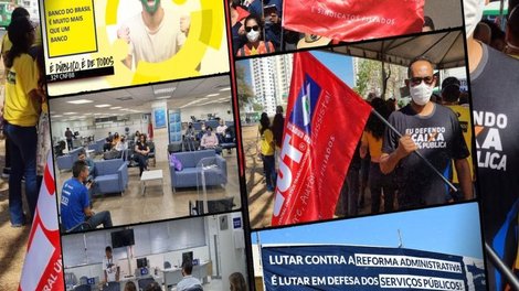 Os protestos e paralisações por todo o país também foram contra a MP 1045, que cria trabalhadores de ''''segunda classe'''', retira direitos e ataca a jornada dos bancários e horas extras. A pauta também inclui a defesa dos bancos públicos e de seu papel social, geração de empregos, o pagamento do auxílio emergencial de R$ 600,00 e vacina para todos.