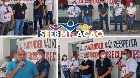 O Sindicato dos Bancários de Mato Grosso (Seeb/MT) promoveu manifestação, panfletagem e reunião com os/as bancárias/os da Agência Santander Praça Alencastro, Centro de Cuiabá, para denunciar a atitude do banco espanhol, marcando, assim o Dia Nacional de Luta contra a terceirização.