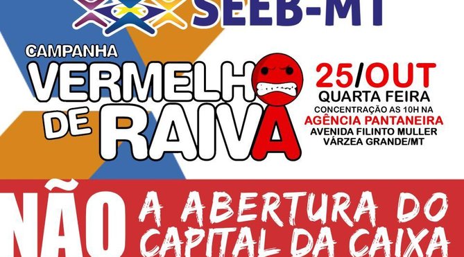 Para intensificar a luta contra a privatização da Caixa, o Sindicato dos Bancários de Mato Grosso (Seeb/MT) realiza Ato e Panfletagem para alertar e convidar a população para se engajar na campanha VERMELHO DE RAIVA , em defesa do emprego, e também na defesa das empresas públicas, fundamentais à economia brasileira, pois são um importante instrumento de política e de promoção do desenvolvimento econômico e social.