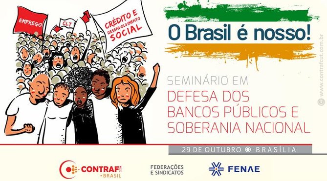 Bancários e bancárias de todo o país vão a Brasília nesta terça-feira (29) para debater a importância dos bancos públicos para a sociedade brasileira. O seminário “O Brasil é nosso” será promovido pelas frentes parlamentares mistas em Defesa da Soberania Nacional e em Defesa dos Bancos Públicos como parte da campanha em defesa dos bancos públicos, da soberania nacional, do crédito, do emprego e do desenvolvimento e conta com o apoio da Confederação Nacional dos Trabalhadores do Ramo Financeiro (Contraf-CUT) e da Federação Nacional das Associações dos Empregados da Caixa (Fenae). O seminário será realizado no teatro do Sindicato dos Bancários de Brasília (EQS 314/315, Bloco A – Asa Sul, Brasília/DF).