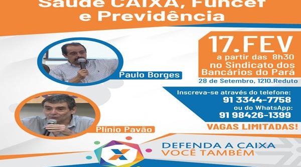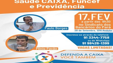 O Seminário “ Saúde Caixa, Funcef e Previdência” ocorrerá na sede do Sindicato em Belém (Rua 28 de setembro, 1210 – Reduto) e as inscrições são limitadas. É necessário se inscrever através do telefone (91) 3344-7758 ou pelo WhatsApp (91) 98426-1399 (com o nome, unidade/agência ou se é aposentado/a, além de contato pessoal, se vai participar de todo o evento, só da manhã/Saúde ou da tarde/Funcef).
