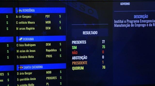 O Senado aprovou nesta terça-feira (16) o Projeto de Lei de Conversão (PLV) 15/2020 (MP 936/2020), que institui o Programa Emergencial de Manutenção do Emprego e da Renda, que, segundo o governo, visa preservar o emprego e a renda; garantir a continuidade das atividades laborais e empresariais; e reduzir o impacto social decorrente das consequências do estado de calamidade pública e de emergência de saúde pública. O texto será encaminhado para a sanção presidencial.