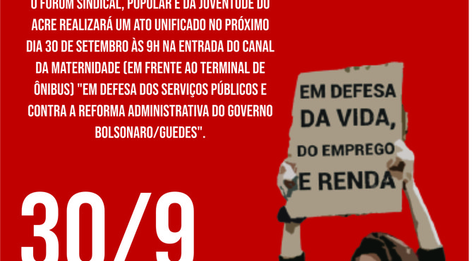O Fórum sindical, popular e da juventude do Acre realizará um Ato unificado no próximo dia 30 de setembro às 9h na entrada do canal da maternidade (em frente ao Terminal de ônibus) “Em defesa dos serviços públicos e contra a Reforma Administrativa do governo Bolsonaro/Guedes”.