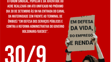 O Fórum sindical, popular e da juventude do Acre realizará um Ato unificado no próximo dia 30 de setembro às 9h na entrada do canal da maternidade (em frente ao Terminal de ônibus) “Em defesa dos serviços públicos e contra a Reforma Administrativa do governo Bolsonaro/Guedes”.