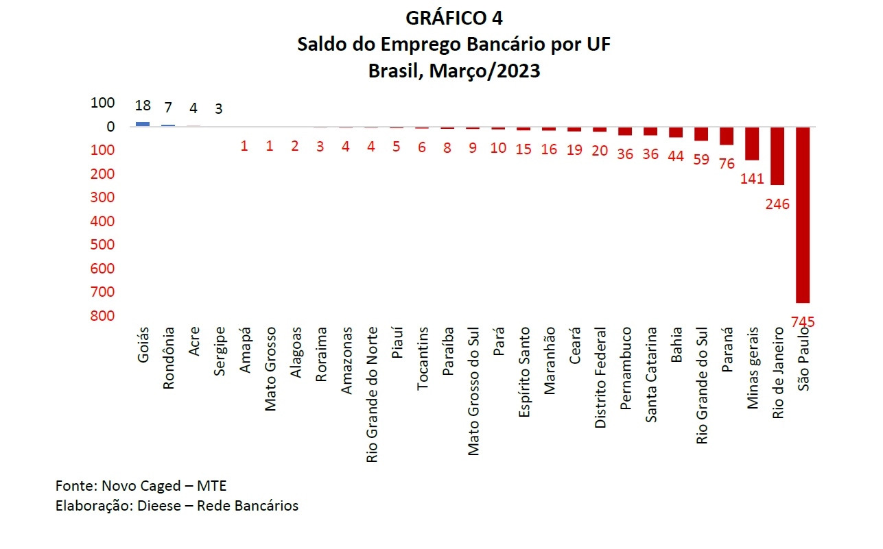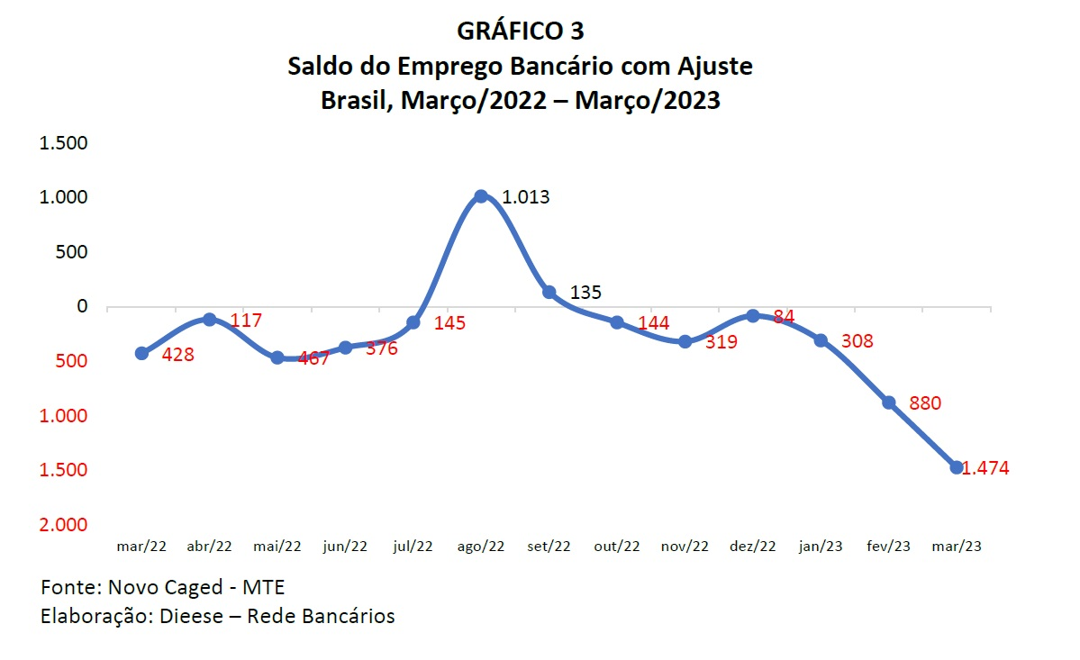 Considerado o período de 12 meses, o saldo negativo de empregos no setor bancário foi de 3.166 vagas. Em todas as atividades bancárias ocorreu saldo negativo no primeiro trimestre de 2023 e no mês de março. No documento, o Dieese ressalta que, no resultado de março para o setor bancário, ocorreu elevado número de demissões, “39,5% superior à média de desligamentos do ano de 2022, e baixo número de contratações, 16,5% inferior à média de admissões do ano de 2022”.