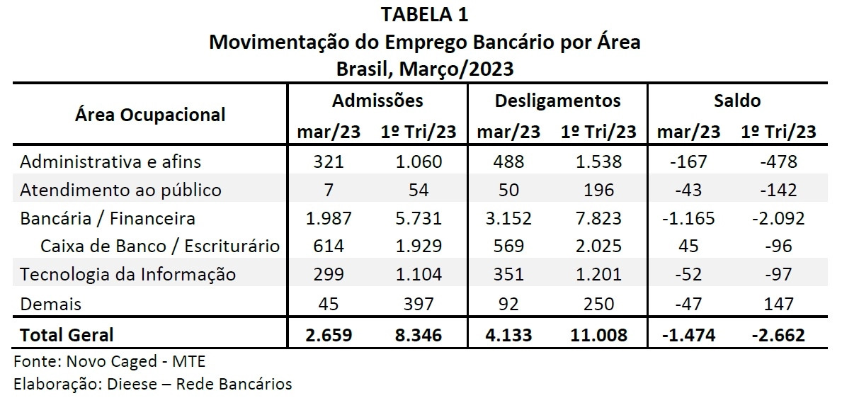 Para melhor compreensão da movimentação de emprego por áreas, a partir da Classificação Brasileira de Ocupações (CBO), o Dieese separou a categoria pelas seguintes áreas específicas: administração e afins, atendimento ao público, tecnologia da informação; e bancária/financeira. Em todas, observou-se saldo negativo para o mês de março e para o primeiro trimestre de 2023.