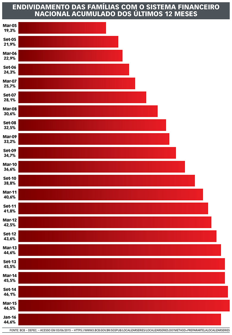 O endividamento das famílias, segundo dados do Banco Central (BC), é bem sintomático do travamento da demanda. Quando a série histórica começou a ser apurada, em março de 2005, a relação entre dívida e renda era de 19,3%, subindo para 44,6% em janeiro de 2016, o último dado apurado. A evolução ao longo desses dez anos mostra que a expansão do mercado imobiliário, com base na dívida para conquistar a casa própria, provoca uma alta no endividamento, que agora retira capacidade das famílias para consumir produtos de menor valor agregado e maior giro.