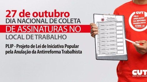 A Central Única dos Trabalhadores (CUT) deliberou por transformar esta sexta-feira 27 de outubro em Dia Nacional de Coleta de Assinaturas a favor Projeto de Lei de Iniciativa Popular (Plip) que revoga a lei da contrarreforma trabalhista do governo ilegítimo de Michel Temer. A Federação dos Bancários do Centro Norte (Fetec-CUT/CN) orienta os sindicatos filiados a se empenharem ao máximo na campanha, que vai até o dia 8 de novembro e tem o propósito de colher 1,3 milhão de assinaturas.