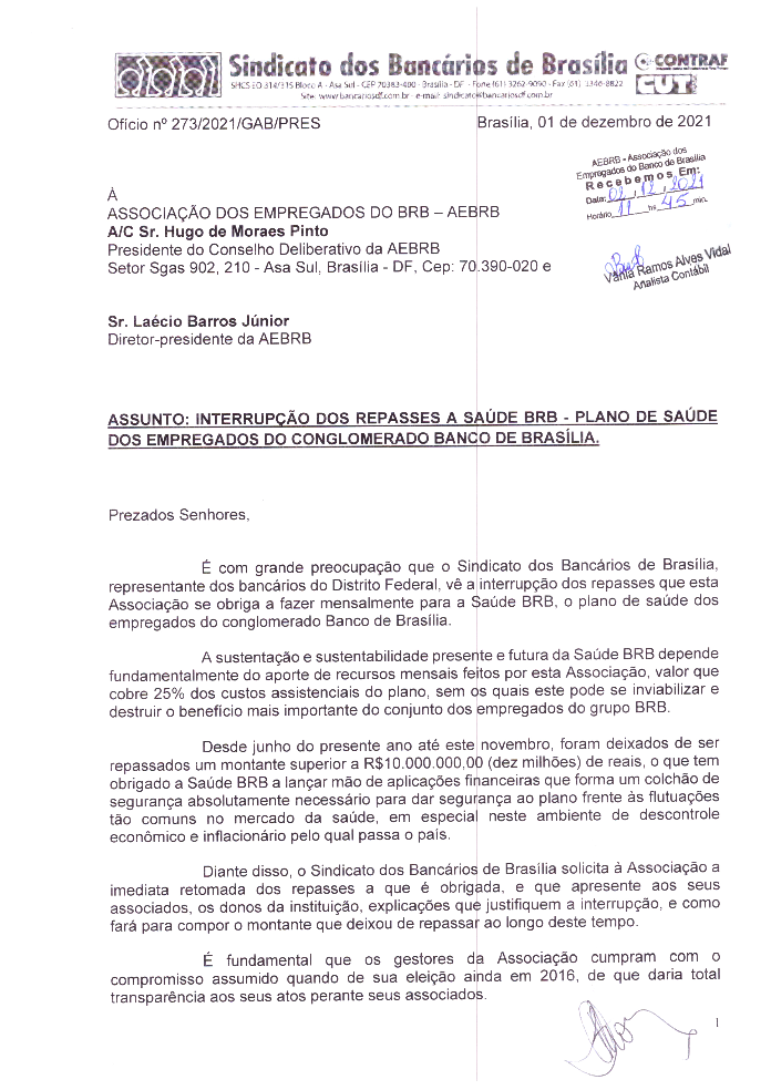 O Sindicato dos Bancários de Brasília enviou ofício na última quinta-feira (2) para a Associação dos Empregados do BRB (AEBRB) cobrando o imediato retorno dos repasses para a Saúde BRB. É importante lembrar que o repasse é obrigatório e consta de acordo firmado entre a Associação e a Saúde. Ao final veja a íntegra do ofício.