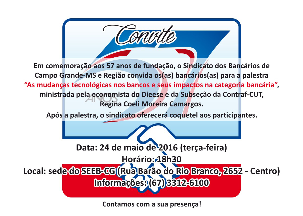 Campo Grande MS - Em comemoração aos 57 anos de fundação, o Sindicato dos Bancários de Campo Grande-MS e Região convida os(as) bancários(as) para a palestra "As mudanças tecnológicas nos bancos e seus impactos na categoria bancária", ministrada pela economista do Dieese e da Subseção da Contraf-CUT, Regina Coeli Moreira Camargos.