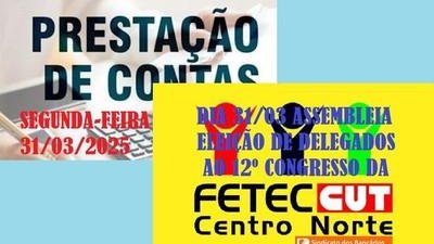 A segunda assembleia delibera, às 18h30 em primeira convocação e às 19h em segunda e última convocação, Escolha dos Delegados para participar do 12º Congresso da Fetec-CUT/CN, conforme edital de convocação com a seguinte pauta: