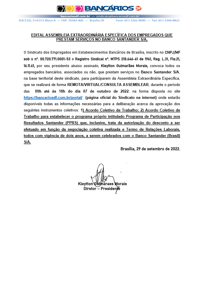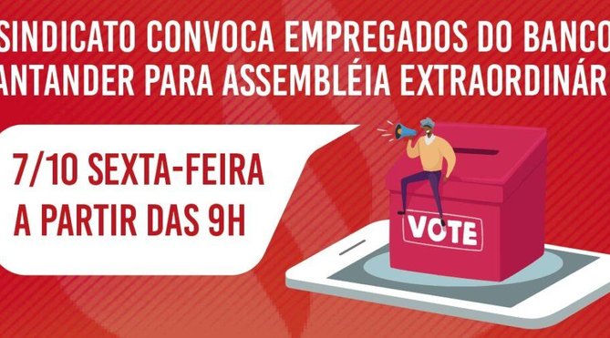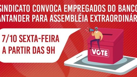 O Sindicato convoca todos os bancários e bancárias que prestam serviços ao Banco Santander para participarem de assembleia extraordinária específica, que será realizada de forma virtual, no período das 9h às 18h, na sexta-feira (7), para deliberarem acerca da aprovação dos seguintes instrumentos coletivos: